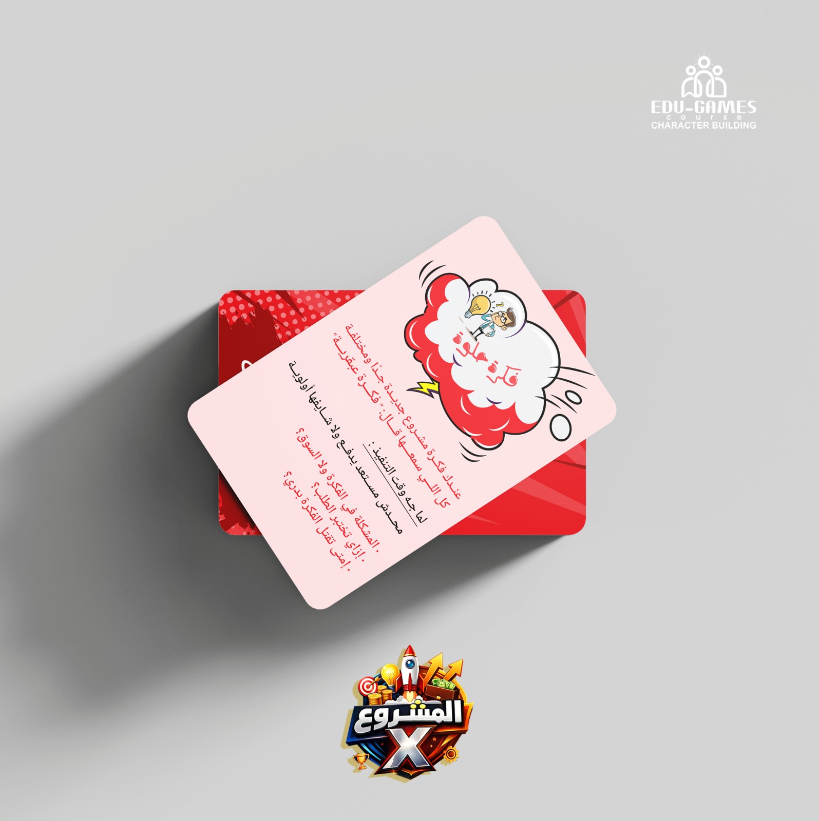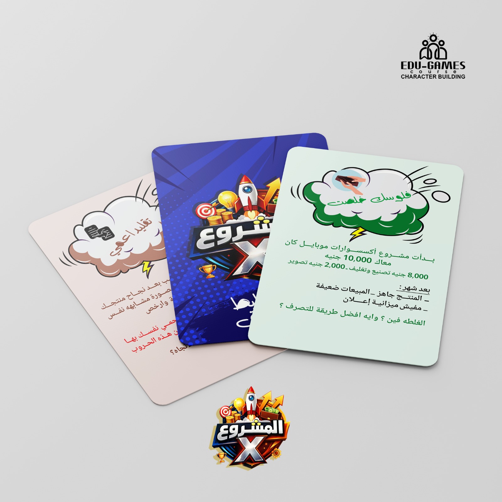 مشروع X هي لعبة تعليمية تعتمد على الكروت، بتدرّب الأطفال والمراهقين (من 10 إلى 18 سنة) على التفكير كرائد أعمال في مواقف حقيقية من عالم المال، التخطيط، القيادة، وصناعة المشاريع.